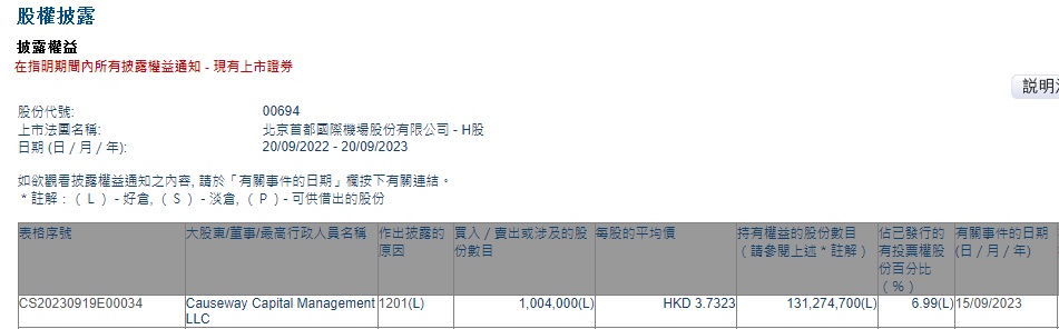 LLC减持北京首都机场股份(00694)100.4万股,每股作价3.7323港元,总金额约为374.72万港元。减持后最新持股数目约为1.31亿股,最新持股比例为6.99%。