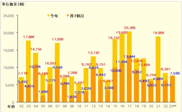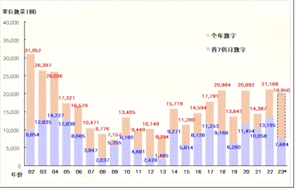 落成量方面,根据香港屋宇署资料显示,2023年7月份全港共有4个项目,合共128个私人住宅单位落成,较6月份的334伙减少近62%;而今年首七个月共有30个项目、涉及7684伙私宅落成,占香港差估署全年预测量约38.5%,并较去年同期的13195伙减少近42%,创四年同期最少。陈海潮估计全年落成量达约1.6万至1.7万伙水平。