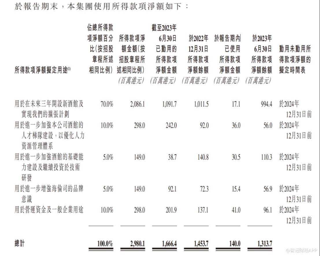 海伦司2023年中报显示,截至2023年6月20日,公司上市募集资金所得款项净额余额为13.14亿港元,其中用于开设新酒馆及实现扩张计划的资金尚余9.94亿港元。
