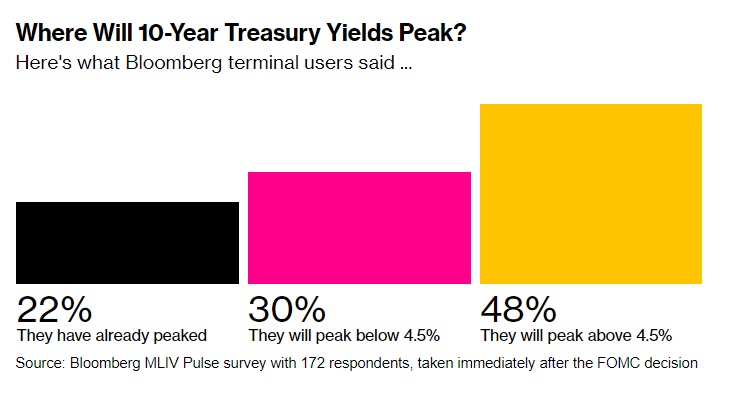 智通财经APP获悉,在美联储暗示可能在明年很长一段时间内将利率维持在高位水平(即higher for longer预期)之后,债券交易员们预计美国国债收益率将继续走高。在美联储利率决定公布后进行的MLIV Pulse实时调查中,172名受访债券交易员中高达58%群体表示,2年期美国国债收益率尚未见顶,而多数人预计有着“全球资产定价之锚”称号的10年期美国国债收益率将攀升至4.5%以上并持续一段时间。