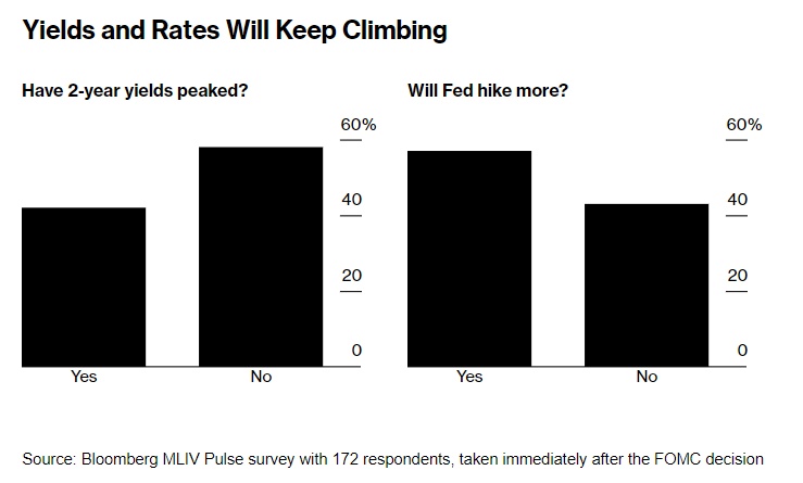 美联储利率决议以及最新利率点阵图等经济预测数据公布后,2年期美债收益率一度升至5.20%,为2006年7月以来的最高水平,10年期美债收益率则一度升至约4.45%,续创2007年以来新高。MLIV Pulse调查是在美联储联邦公开市场委员会(FOMC)做出最新利率决定后的90分钟内所进行。
