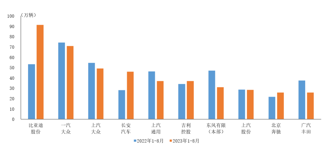 智通财经APP获悉,9月21日,据中国汽车工业协会统计分析,2023年1-8月,销量排名前十位的轿车生产企业共销售441.4万辆,占轿车销售总量的63.8%。在上述十家企业中,与上年同期相比,比亚迪股份(01211)、长安汽车(000625.SZ)和北京奔驰呈两位数较快增长,吉利汽车(00175)小幅增长,其他企业呈不同程度下降。