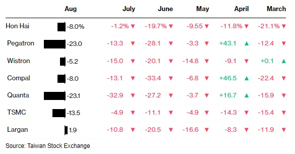 智通财经APP获悉,由于消费者需求疲软拖累了整个电子行业,苹果(AAPL.US)在中国台湾的主要供应商8月份的销售额再次出现两位数的下滑。数据显示,中国台湾主要组装商和制造商的总营收为9514.1亿新台币(合296亿美元),较上年同期下降12.3%。