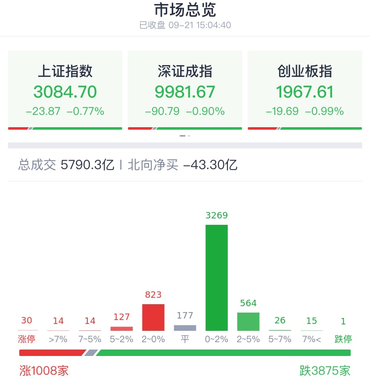9月21日,A股全天震荡调整,三大指数均收跌,沪指跌破3100点,深成指跌破10000点,市场除华为概念股外热点相对匮乏。截至收盘,沪指跌0.77%,深成指跌0.9%,创业板指跌0.99%。