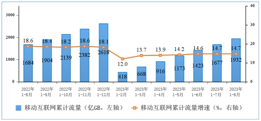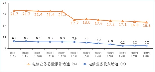 智通财经APP获悉,9月21日,工信部发布2023年1-8月份通信业经济运行情况。数据显示,1-8月份,信息通信行业整体运行平稳。电信业务收入和业务总量稳步增长,云计算等新兴业务保持较快增速;5G、千兆光网、物联网等新型基础设施建设持续推进,网络连接用户规模不断扩大,移动互联网接入流量较快增长。1-8月份,电信业务收入累计完成11417亿元,同比增长6.2%。按照上年不变价计算的电信业务总量同比增长16.6%。