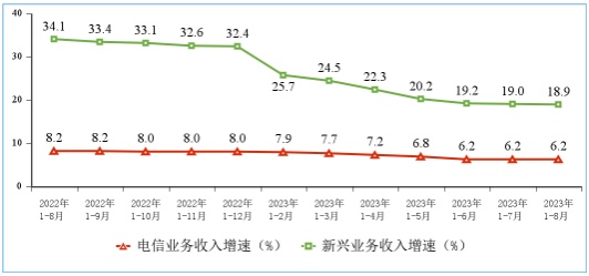 新兴业务收入保持较快增长。三家基础电信企业积极发展云计算、大数据、物联网、互联网数据中心等新兴业务,1-8月份共完成业务收入2392亿元,同比增长18.9%,在电信业务收入中占比为21%,拉动电信业务收入增长3.5个百分点。其中云计算和大数据收入同比增速分别达35.4%和44.8%,物联网业务收入同比增长24.8%。