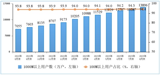 固定宽带接入用户稳步增加,千兆用户规模持续扩大。截至8月末,三家基础电信企业的固定互联网宽带接入用户总数达6.22亿户,比上年末净增3214万户。其中,100Mbps及以上接入速率的固定互联网宽带接入用户达5.87亿户,占总用户数的94.4%,占比较上年末提升0.5个百分点;1000Mbps及以上接入速率的固定互联网宽带接入用户达1.39亿户,比上年末净增4722万户,占总用户数的22.3%。在高速率用户持续增长拉动下,家庭户均接入带宽达428.3Mbps/户,同比增长26.7%。