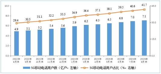 移动电话用户规模稳中有增,5G用户数快速发展。截至8月末,三家基础电信企业的移动电话用户总数达17.14亿户,比上年末净增3074万户。其中,5G移动电话用户达7.14亿户,比上年末净增1.54亿户,占移动电话用户的41.7%,占比较上年末提高8.4个百分点。