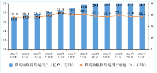 蜂窝物联网用户较快增长。截至8月末,三家基础电信企业发展蜂窝物联网终端用户21.77亿户,比上年末净增3.32亿户,占移动网终端连接数(包括移动电话用户和蜂窝物联网终端用户)的比重达55.9%。其中,应用于公共服务、车联网、智慧零售、智慧家居的物联网终端规模已分别达7亿、4.4亿、3.2亿、2.4亿户。
