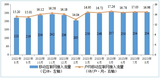 移动互联网流量较快增长,8月DOU值维持高位。1-8月份,移动互联网累计流量达1932亿GB,同比增长14.7%,增速与1-7月份持平。截至8月末,移动互联网用户数达15.01亿户,比上年末净增4710万户。8月当月户均移动互联网接入流量(DOU)达到16.98GB/户·月,同比增长11.7%,比上年底高0.8GB/户·月。