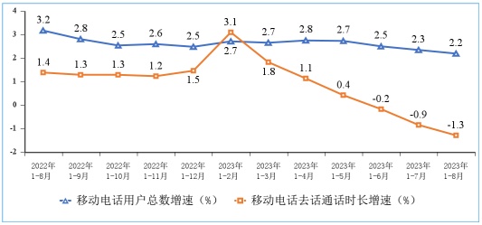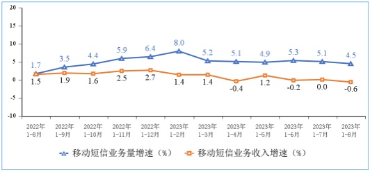 移动传统业务持续收缩。1-8月份,移动电话去话通话时长完成1.5万亿分钟,同比下降1.3%;固定电话主叫通话时长完成528.5亿分钟,同比下降5.2%。1-8月份,全国移动短信业务量同比增长4.5%,移动短信业务收入同比下降0.6%,增速较1-7月份均回落0.6个百分点。