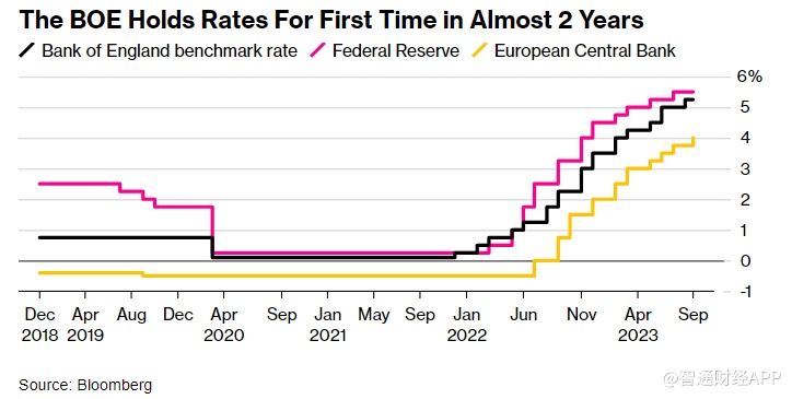 智通财经APP获悉,在通胀率下降和对经济衰退的担忧加剧之际,英国央行停止了30多年来最激进的加息周期。英国央行周四将基准利率维持在5.25%,市场预期加息25个基点。该行此前连续14次加息,自2021年12月以来累计加息515个基点。