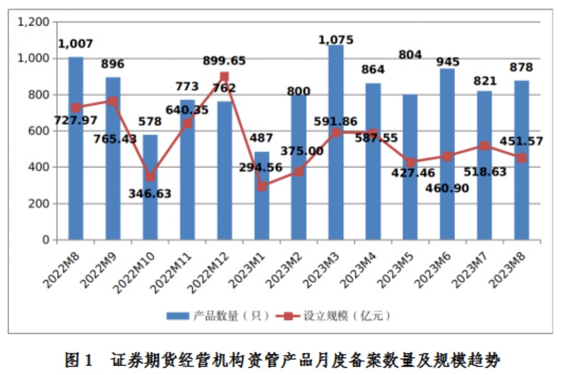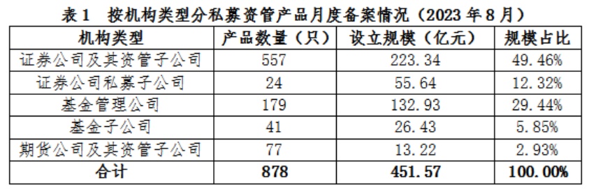 智通财经APP获悉,9月21日,中基协发布数据显示,2023年8月,证券期货经营机构当月共备案私募资管产品878只,设立规模451.57亿元。从机构类型看,8月备案私募资管产品数量最多、设立规模最大的为证券公司及其资管子公司。证券公司私募子公司8月备案的24只私募基金中,23只为合伙型、1只为契约型。