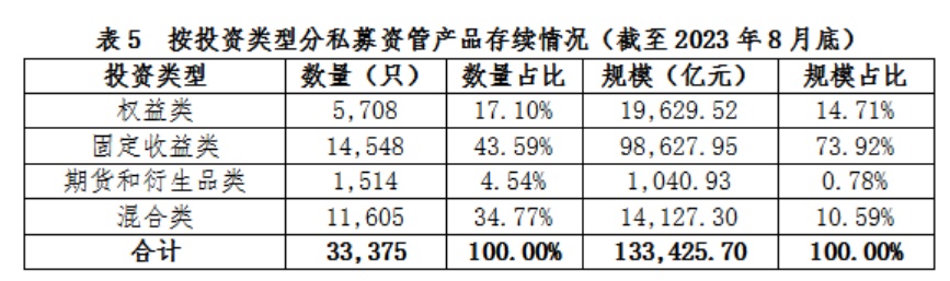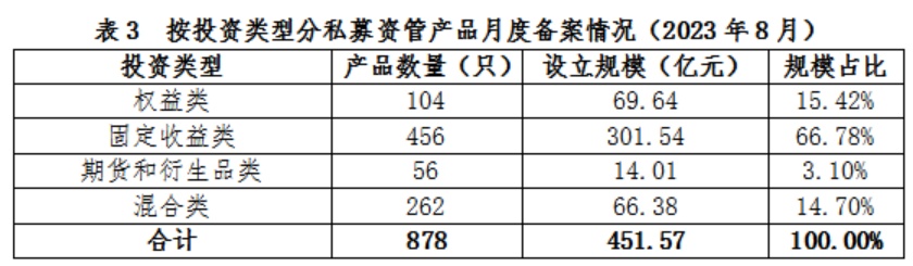从投资类型看,8月备案私募资管产品数量最多、设立规模最大的为固定收益类。