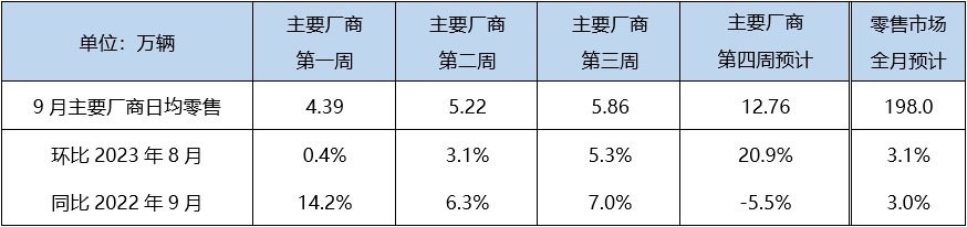 主要厂商零售9月第一周日均4.39万,受同期中秋节假期影响,同比增长14.2%。主要厂商第二周日均零售5.22万,同比增长6.3%,车市热度延续。企业季度末冲量在即叠加中秋国庆长假前购车需求提前释放,第三周车市日均零售预计5.86万,同比增长7.0%。第四周中秋国庆长假来临,工作日与往年同期相比少,预计日均零售12.76万辆,同比-5.5%。