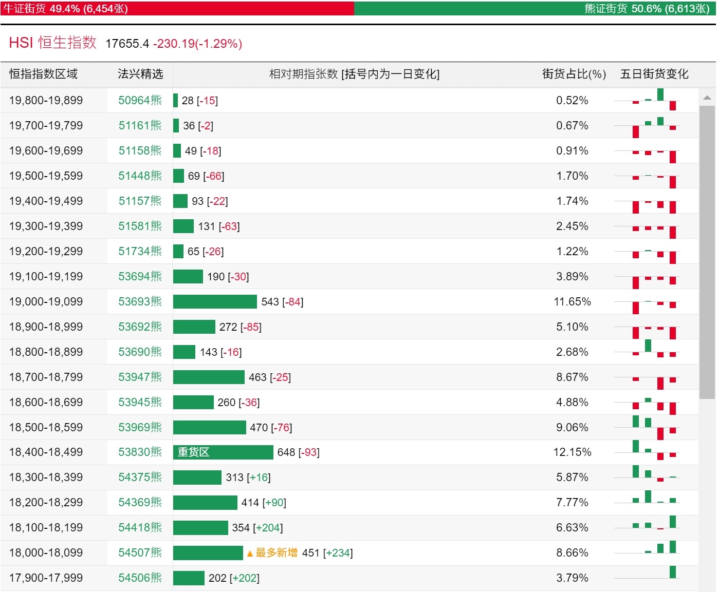 法兴恒指牛熊证街货分布图中的数据显示,熊证街货重货区在18400-18499区间,该区间最新熊证数量为648张,较上一交易日减少93张;最多新增在18000-18099区间,该区间最新熊证数量为451张,较上一交易日增加234张。