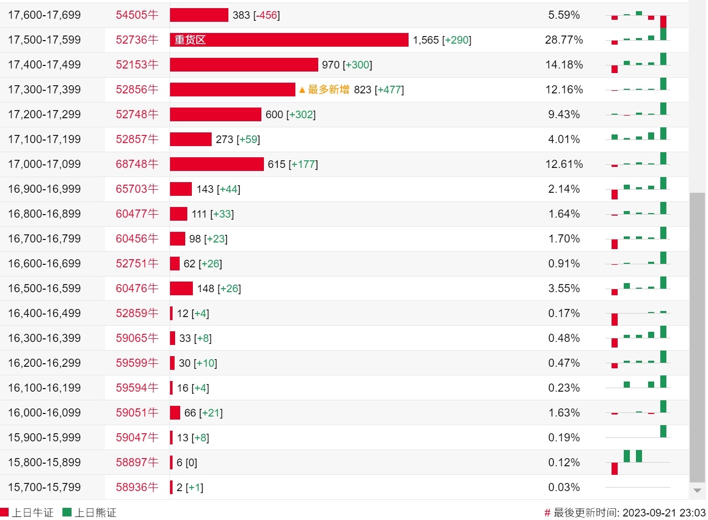 牛证街货重货区在17500-17599区间,该区间最新牛证数量为1565张,较上一交易日增加290张;最多新增在17300-17399区间,该区间最新牛证数量为823张,较上一交易日增加477张。