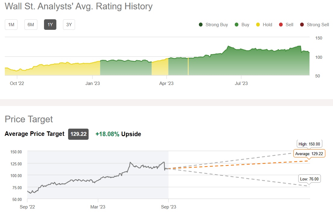 总体而言,根据Seeking Alpha汇编的华尔街分析师共识评级以及目标价,分析师们对甲骨文的共识评级为“买入”,平均目标价预期则高达129.22美元,意味着未来12个月潜在上行空间超过18%。