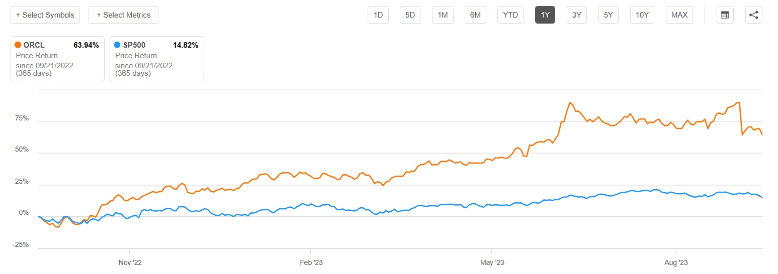 乘着AI东风,甲骨文今年以来股价涨幅达到38%,一度涨至历史最高点,但近期公布不及预期的下一季度业绩展望后股价有所回落,不过仍远超标普500指数涨幅,一年期涨幅更是超过60%。在全球科技企业加大力度布局AI技术的热潮之下,甲骨文可谓该热潮的最大赢家之一,其云计算基础设施(IaaS)和云应用软件的全球客户规模正变得愈发庞大。