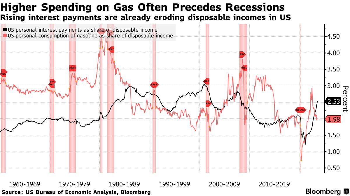 能源成本飙升是美联储在试图引导美国经济实现“软着陆”时面临的熟悉宿敌,国际油价暴涨曾导致美国经济在上世纪70年代中期、80年代初和90年代陷入衰退,因其推高了通胀并侵蚀了消费者的购买力。