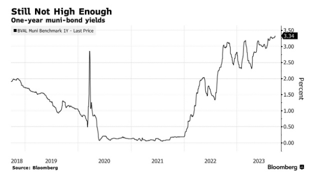 这是因为他们正在以创纪录的速度抢购现金类产品,目前货币市场基金和高收益储蓄账户的收益率分别超过了5%和4%。相比之下,评级最高的AAA级市政债券的收益率仅在3%至4%之间(具体取决于到期日),资金一直在从市政债券领域流出。