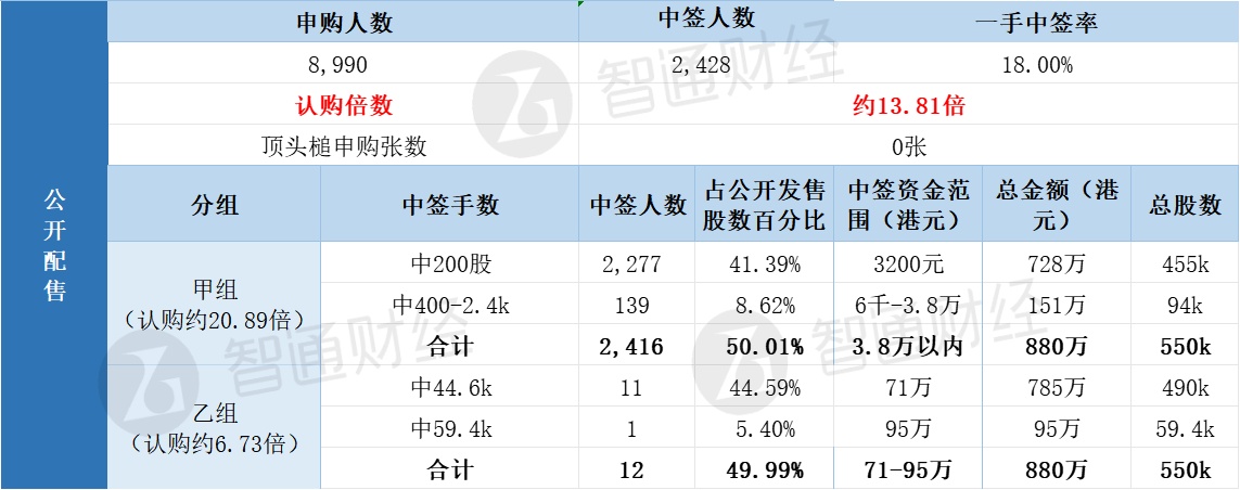 其中,公开配售申购人数8990人,一手中签率18%,认购倍数约13.81倍。