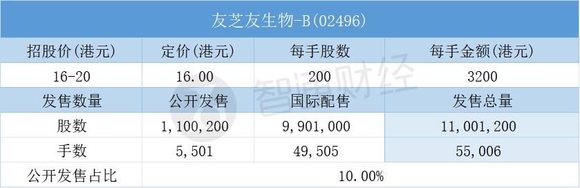 智通财经APP获悉,9月22日,友芝友生物-B(02496)配售结束。配售招股价16-20港元,最终定价16港元,每手3200港元。