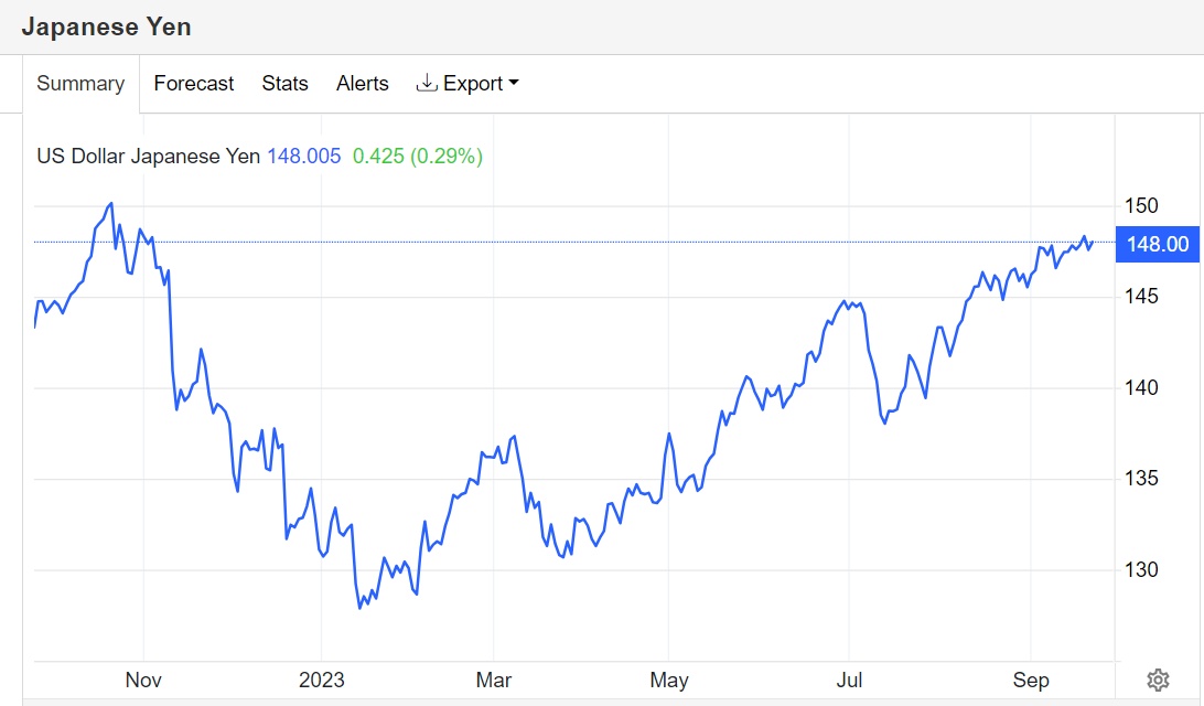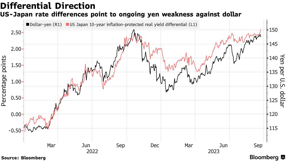美联储在本周决定维持利率不变,并暗示可能再次加息,这一决定推动美元兑日元一度升至148.46这一10个月新低。由于日本多年来维持负利率而美联储自去年开启一代人以来最激进加息周期,造成日本和美国之间的基准国债收益率差值不断扩大,这是推动日元汇率下跌的最主要因素。
