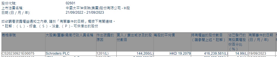 智通财经APP获悉,香港联交所最新资料显示,9月19日,Schroders PLC减持中国太保(02601)14.42万股,每股作价19.2079港元,总金额约为276.98万港元。减持后最新持股数目约为4.16亿股,最新持股比例为14.99%。