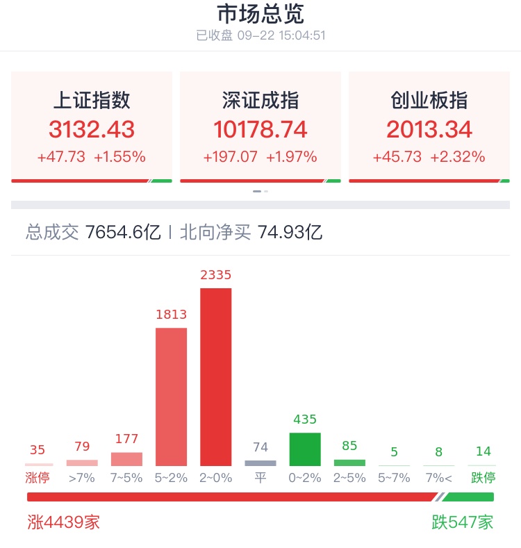 9月22日,市场情绪回暖,A股三大指数全线反弹,沪指重回3100点上方,创业板指、上证50指数均涨超2%。截至收盘,上证指数涨1.55%,深证成指涨1.97%,创业板指涨2.32%。