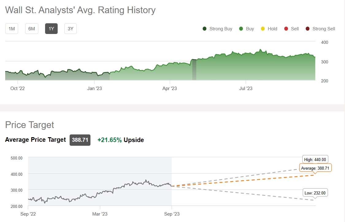 总体而言,Seeking Alpha汇编的华尔街分析师共识评级以及目标价显示,华尔街分析师们对微软的共识评级为“买入”,平均目标价预期则高达388.71美元这一历史新高,意味着未来12个月潜在上行空间接近22%。