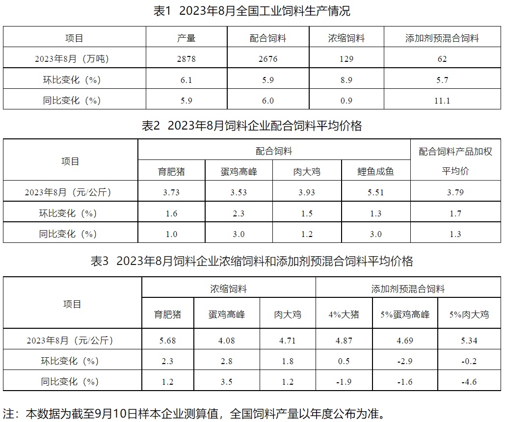 智通财经APP获悉,9月22日,中国饲料工业协会发布2023年8月份全国饲料生产形势。据样本企业数据测算,2023年8月,全国工业饲料产量2878万吨,环比增长6.1%,同比增长5.9%。主要配合饲料、浓缩饲料产品出厂价格环比以涨为主,添加剂预混合饲料产品出厂价格环比以降为主。饲料企业生产的配合饲料中玉米用量占比为22.8%,同比下降8.0个百分点;配合饲料和浓缩饲料中豆粕用量占比11.9%,同比下降4.0个百分点。