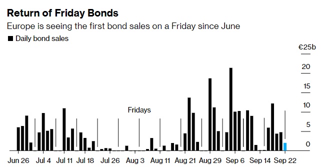 而9月份作为销售旺季,通常一周中的每天都要债券发售,现在这种周五没有债券发售的情况将被打破。根据数据,加拿大皇家银行和德国证交所将在周五发售债券,为13周以来首次。德国证交所周四为此次上市召开了投资者会议,知情人士说,营销活动获得了很好的反馈,因此该公司选择在周末之前完成发债。数据显示,本周企业、金融和公共部门借款人已经发行了超过270亿欧元的债券,周五的交易将使总发行量至少增加20亿欧元。