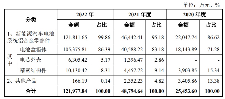 据招股书,新铝时代主要从事新能源汽车电池系统铝合金零部件的研发、生产和销售,拥有铝合金材料研发、产品设计、先进生产工艺以及规模化生产的完整业务体系。公司主要产品为电池盒箱体,是新能源汽车动力电池系统的关键组成部分。