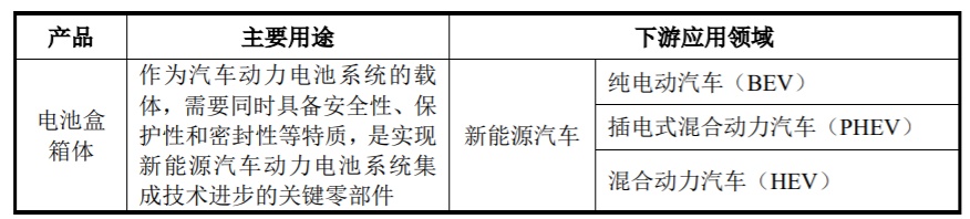 报告期内,公司电池盒箱体收入占公司主营业务收入的比例分别为71.28%、83.18%和86.39%,是公司主营业务收入的主要来源。电池盒箱体在下游新能源汽车行业的应用如下: