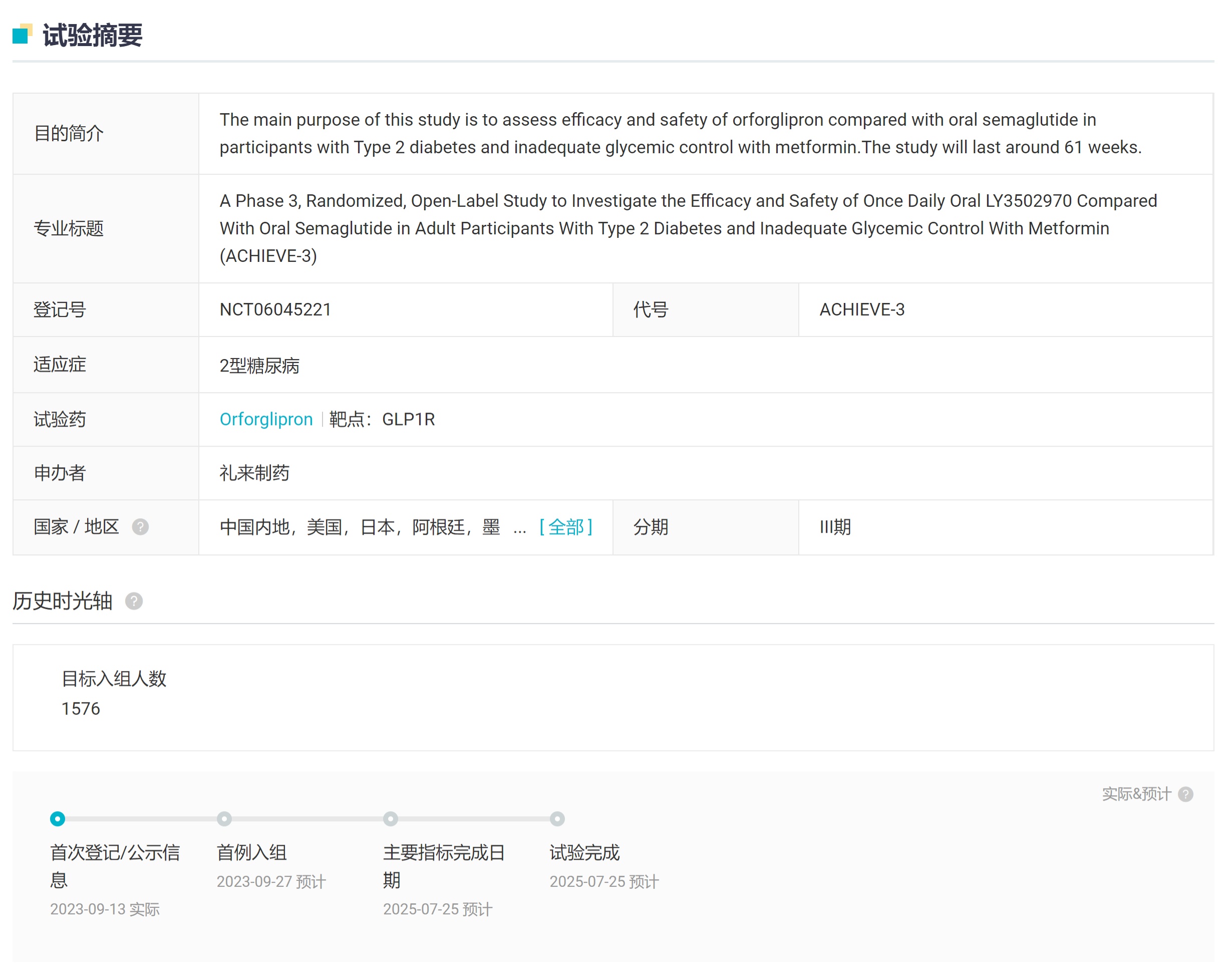 智通财经APP获悉,近日,礼来(LLY.US)公示启动了GLP-1R激动剂小分子Orforglipron(LY3502970)的第7项III期临床试验ACHIEVE-3,针对2型糖尿病。值得一提的是,这项全球多中心III期临床对同领域王者发起了挑战,对照组设定为口服司美格鲁肽,颇似曾经Tirzepatide头对头挑战的架势。Orforglipron也正是当前全球进展最快的同类药物,除此之外暂未有其他GLP-1R激动剂小分子药物启动III期临床。