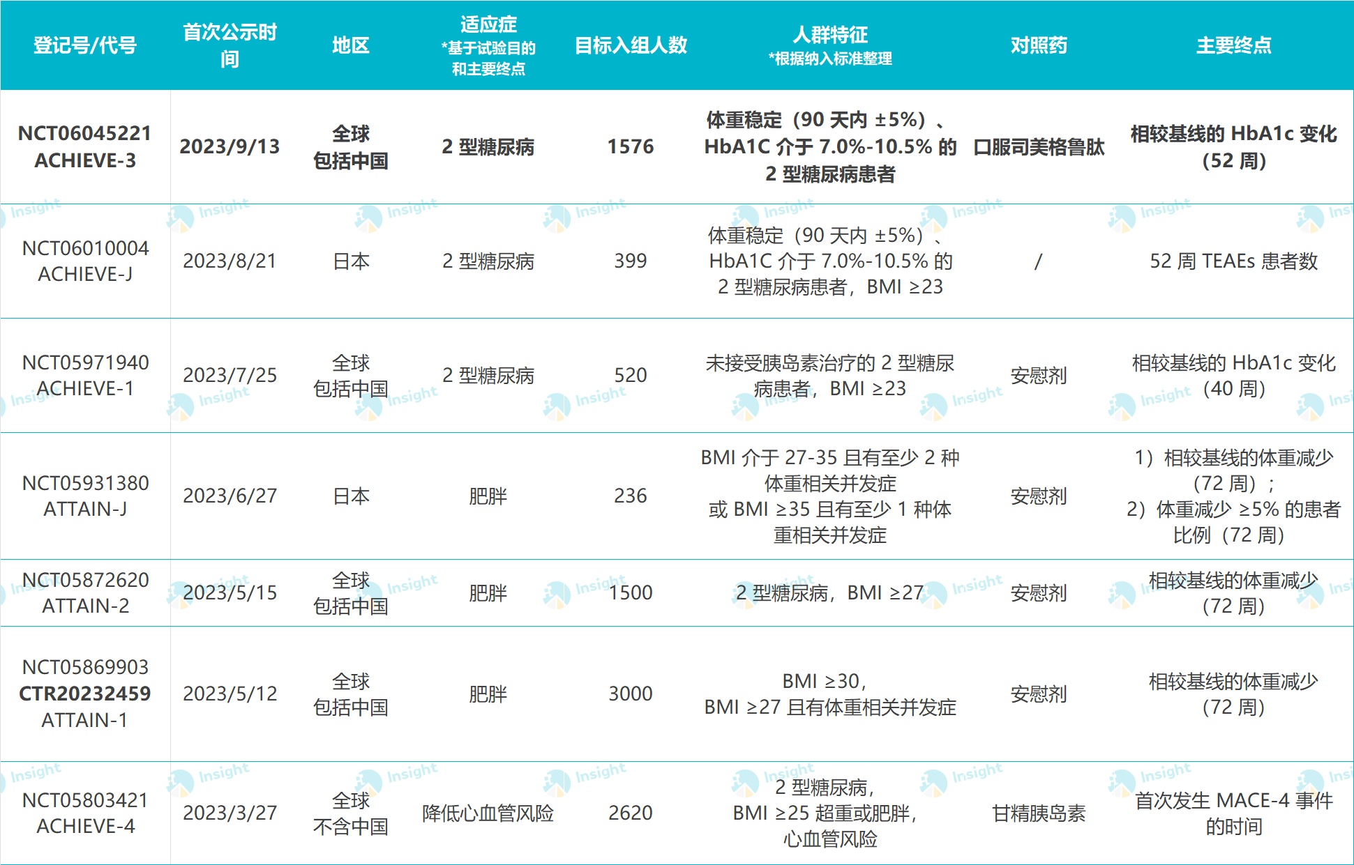 据Insight数据库,Orforglipron当前已经针对肥胖、心血管疾病、2型糖尿病分别启动了多项III期研究,全速推进。