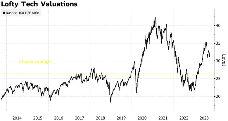 以科技股为主的纳斯达克100指数9月份迄今已下跌逾5%,有望连续下跌,并创下2023年以来最糟糕的单月表现,因为特斯拉(TSLA.US)和微软(MSFT.US)等蹭领涨美股的企业也开始步履蹒跚。即使考虑到泡沫,该指数的市盈率仍在31倍以上——低于2021年的美股繁荣时期,但高于过去10年的几乎任何时候。