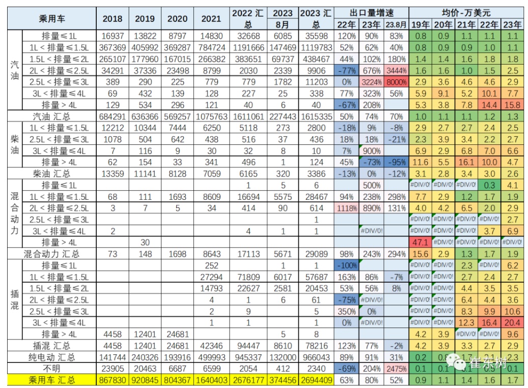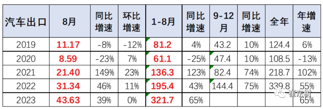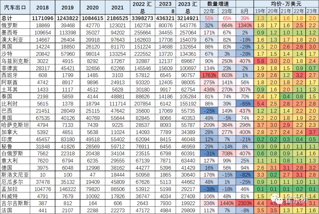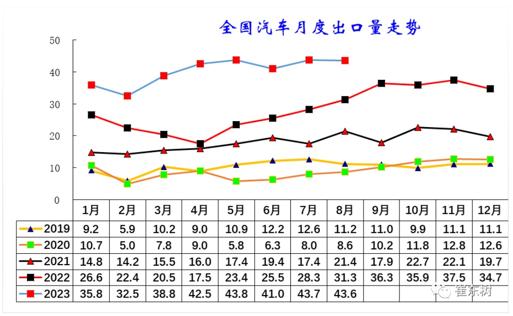智通财经APP获悉,9月24日,乘联会秘书长崔东树发文称,2023年8月中国汽车出口达到43.6万台,8月出口继续保持历史高位的走势。由于2022年的上海恢复带来的高基数和个别品牌出口波动,今年8月的出口增长超过39%,因此中国汽车出口暴增的局面已经持续出现。1-8月中国汽车实现出口322万台,出口增速65%的持续超强增长。2023年汽车出口均价2.0万美元,同比2022年的1.8万美元,均价大幅提升。
