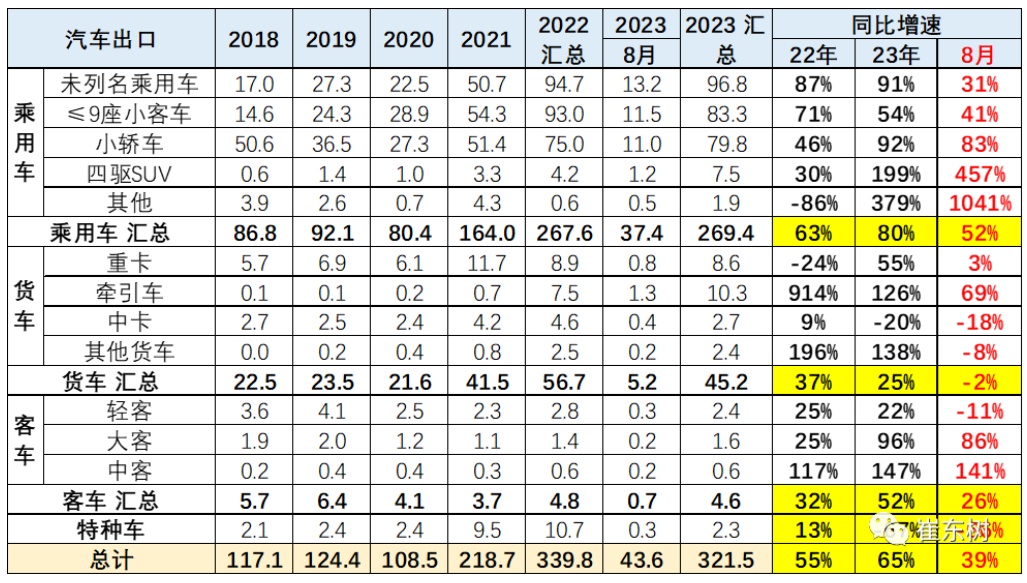 2023年1-8月的汽车出口是全面走强,乘用车是出口主力,增速80%,其中四驱SUV、未列名乘用车出口较好。今年客车和特种车出口表现一般。
