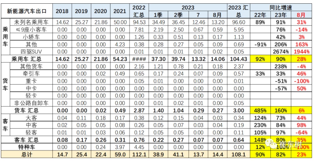 2023年1-8月出口新能源车108万台,同比增长82%;其中2023年新能源乘用车出口104万台,同比增长90%,占比新能源汽车出口96%。新能源专用车的出口也增长较快。
