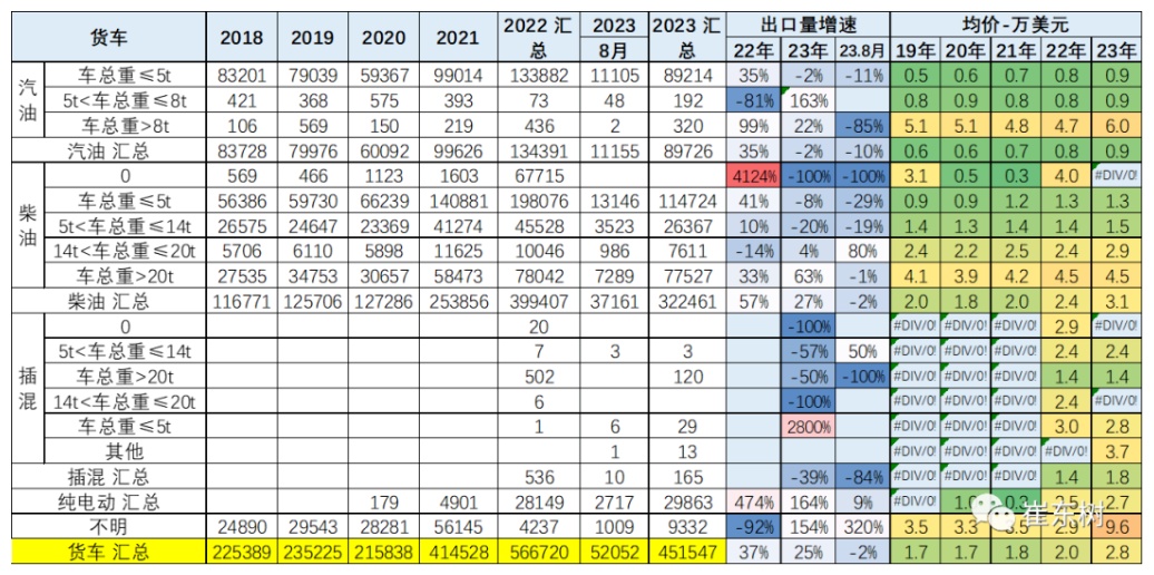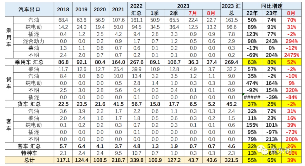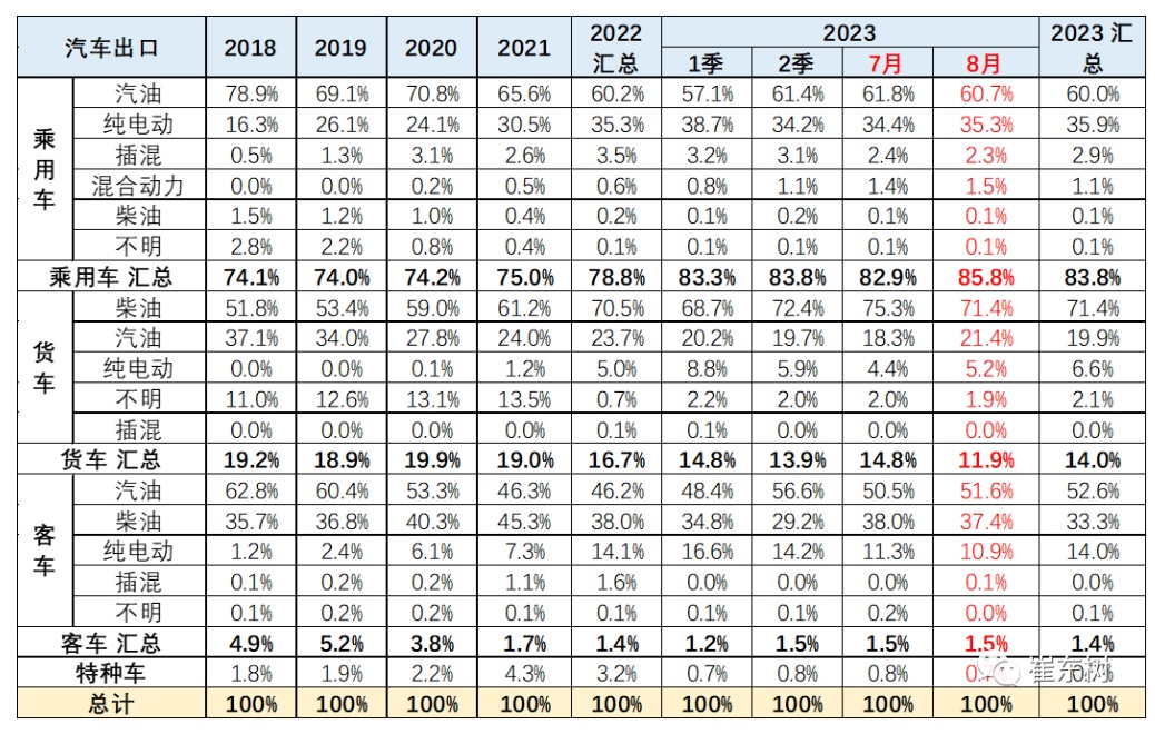 2023年的乘用车的出口增速超强于2022年增速。纯电动货车的出口总体很强,但8月回落。汽油车的8月出口很强,这是很好的表现。