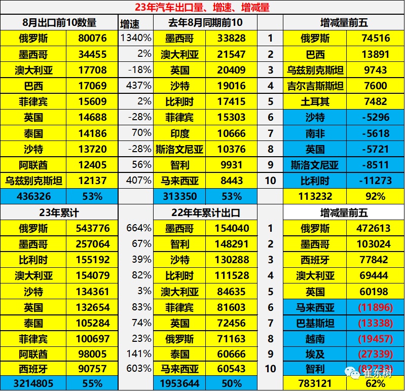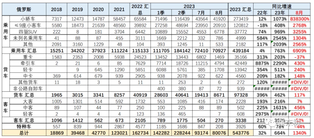 2022年中国对俄罗斯出口16万台,2023年1-8月中国对俄罗斯汽车出口54.4万台,同比增长664%。8月中国对俄罗斯出口8万台车,同比增长1340%,环比下降15%。俄罗斯突然变成中国汽车出口第一大市场,这是时隔15年后中国汽车再一次的出口巨变,当年中国自主品牌进军俄罗斯的市场表现很好,但随着俄罗斯对中国汽车巨额加征关税政策,当年中国汽车几乎退出俄罗斯。