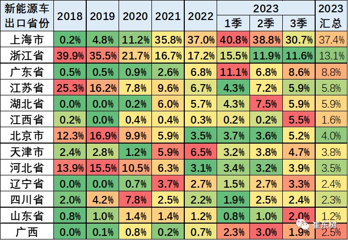 随着特斯拉进入中国,中国汽车出口格局改变。2023年新能源汽车出口比较强的地区是上海、浙江、广东、江苏、湖北等。