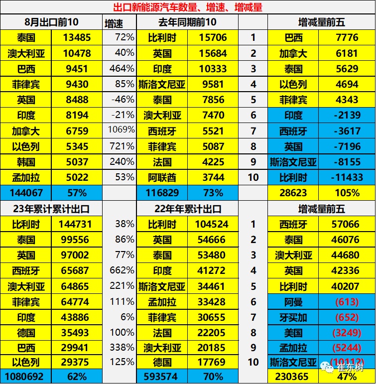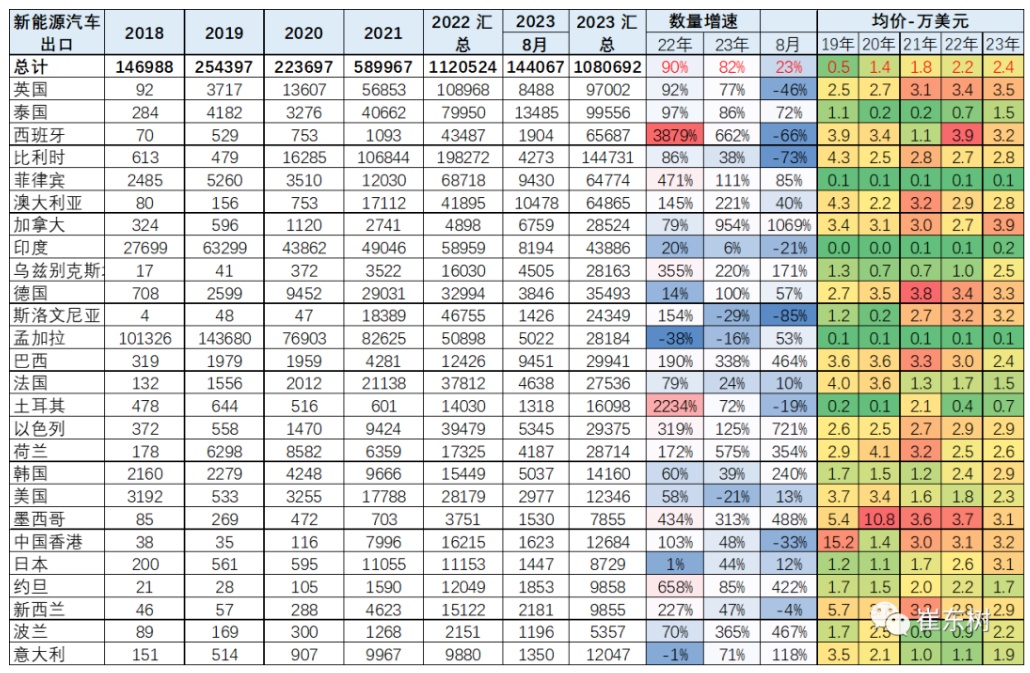 2023年1-8月中国新能源乘用车出口108万台,达到82%的强势增长。8月新能源汽车出口14.4万台,同比增长23%。今年中国对欧洲国家的新能源车出口表现很强,对印度、孟加拉、菲律宾的出口走势分化,但均价均很低。