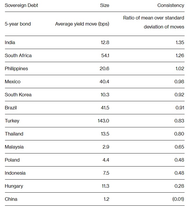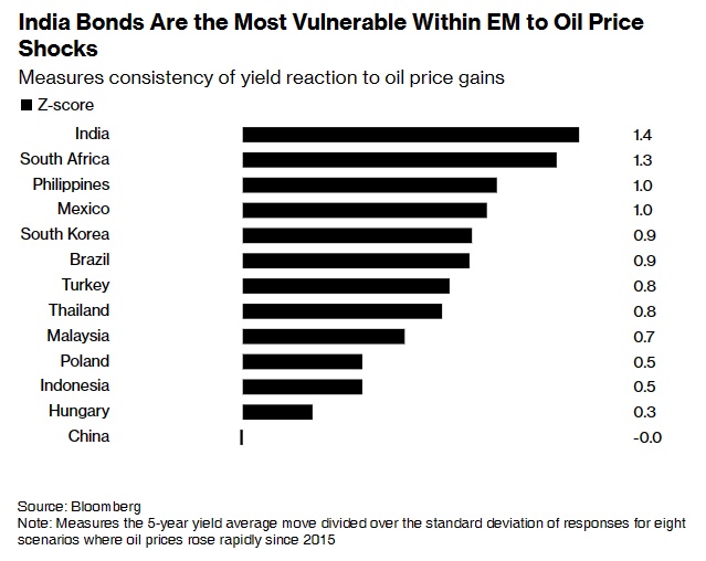 根据媒体对13个主要新兴市场五年期政府债券的分析,印度债券最容易受到油价飙升的影响,自2015年以来收益率8次平均上涨了13个基点。不过,包括Sonal Varma在内的野村控股经济学家表示,与以往不同的是,由于印度即将举行的邦选举和大选,油价上涨不太可能转化为印度零售价格的上涨,“这意味着对通胀影响有限,但对双重赤字(即财政赤字与贸易赤字)的溢出效应更大”。