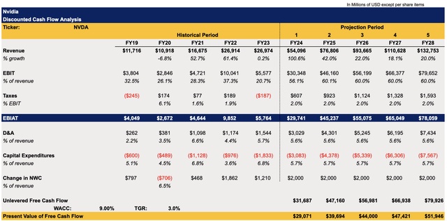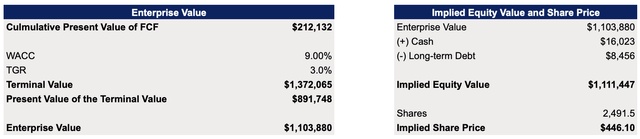 有鉴于此,Bohdan Kucheriavyi认为,有理由相信英伟达的增长故事远未结束。不过,一些投资者质疑英伟达的股价在当前的大幅飙升之后是否还有上行空间?为此,Bohdan Kucheriavyi建立了一个新的贴现现金流(DCF)模型。该模型显示,英伟达的公允价值为每股446.10美元,接近当前的股价。