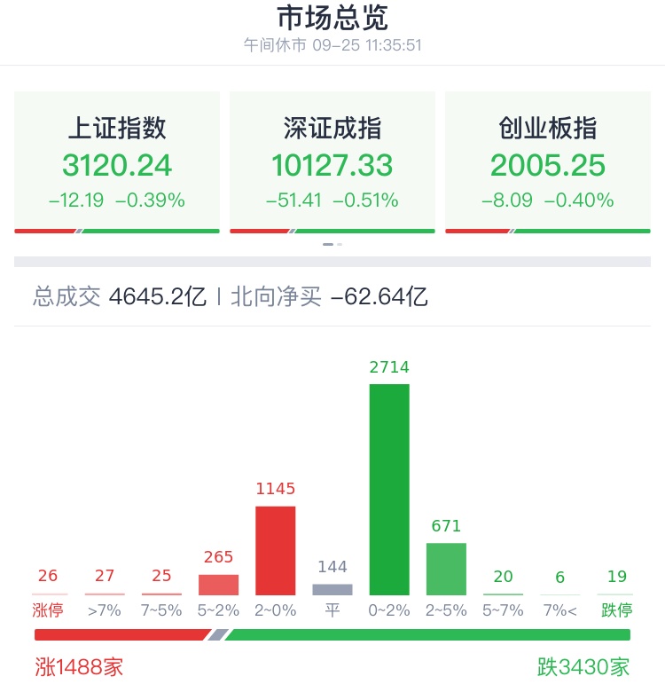 9月25日两市全天弱势震荡,地产、金融等权重股走低拖累指数,新型工业化、减肥药、华为等题材股轮番表现。截至收盘,沪指跌幅0.54%,创业板指跌幅0.4%。