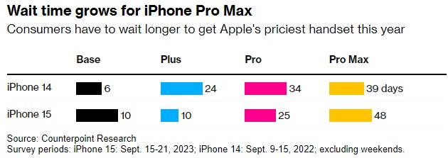另一方面,研究人员发现,苹果的顶级旗舰机型iPhone 15 Pro Max也将预订等待时间延长到了创纪录的水平。这两款机型的重大升级推动了需求的复苏,尽管其中一些需求是以牺牲苹果的其他选择为代价的,比如iPhone 15 Plus和iPhone 15 Pro,这两款机型的等待时间都缩短了。