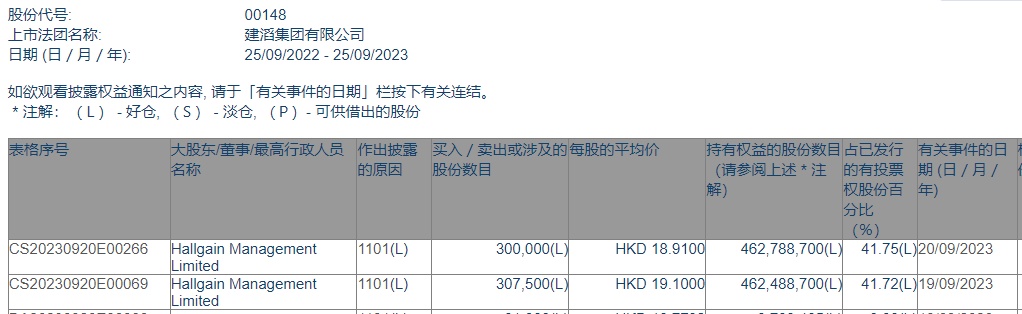 智通财经APP获悉,香港联交所最新资料显示,9月19日至20日,Hallgain Management Limited两日分别增持建滔集团(00148)30.75及30万股,每股作价分别为19.1港元及18.91港元,总金额约为1154.63万港元。增持后最新持股数目约为4.63亿股,最新持股比例为41.75%。